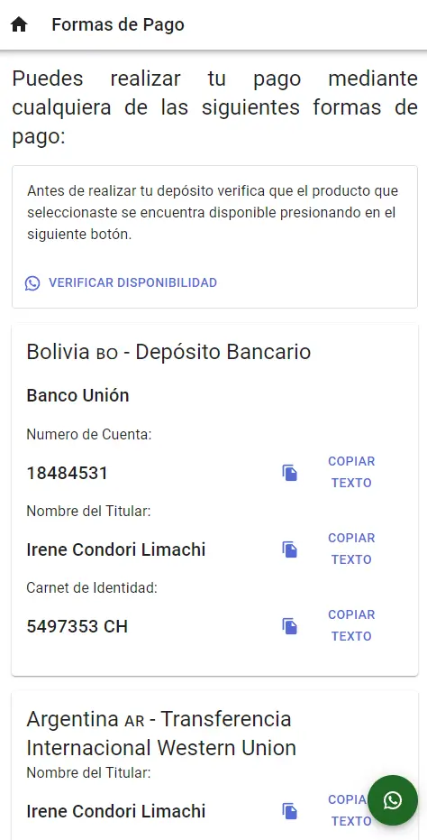 Luego de realizar el depósito o transferencia internacional, envianos tu comprobante para verificar el pago y proceder con el envio.